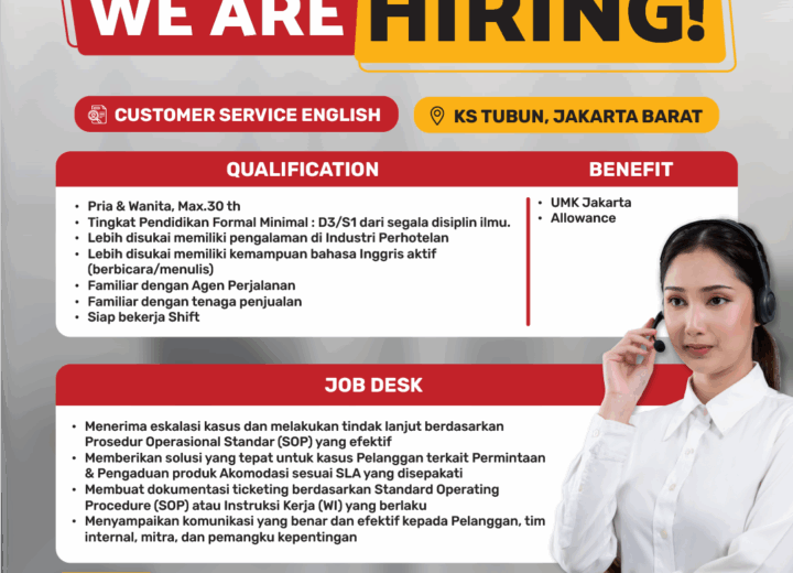 MPO Customer Service English Qualification 1. Pria & Wanita, Max.30 th2. Tingkat Pendidikan Formal Minimal : D3/S1 dari segala disiplin ilmu.3. Lebih disukai memiliki pengalaman di Industri Perhotelan4. Lebih disukai