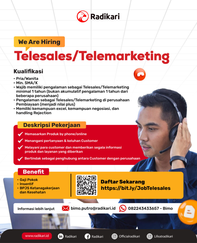 Bergabunglah bersama Radikari sebagai Telesales / Telemarketing dan bantu pelanggan mendapatkan produk terbaik melalui komunikasi yang efektif dan profesional.