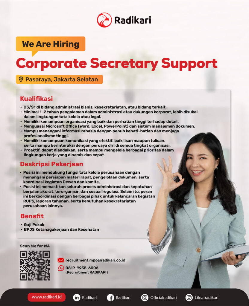 Radikari membuka kesempatan bagi profesional yang memiliki ketelitian tinggi, kemampuan administrasi yang kuat, serta pemahaman dalam pengelolaan dokumen korporat untuk bergabung sebagai Corporate Secretary Support. Posisi ini berperan penting dalam mendukung tata kelola perusahaan, memastikan proses administrasi berjalan akurat, dan membantu kelancaran kegiatan Direksi, Dewan Komisaris, serta komite perusahaan